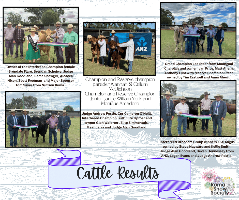 Cattle Section 2AStud Cattle Chief Steward Matt Ahern[email protected] Section 2BLed Steer or Heifer Chief Steward Matt Ahern[email protected] Section 2CJunior Judge & Junior Parader Chief Steward Matt Ahern[email protected] Roma Show 2025 Results Cattle section proudly supported by:-
